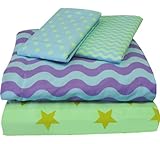 Full/double size flat sheet, fitted sheet, pillowcases. This is a unique concept by. It is like 2 sheet sets in 1. Each set is designed to be usable as two separate patterns. One-half of the flat sheet and fitted sheet have stars shapes on them. The other half of the flat sheet and fitted sheet have waves. The pillowcases are reversible, with each side bearing a different pattern to coordinate with the side of sheets you are using. Sorry, matching comforters are sold out. Fabric is 100% premium cotton. 100% COTTON BED SHEET SET. ... CONTENTS: One full flat bed sheet, finished size 81 x 96 inches (206 x 244 cm); One full fitted sheet Both of the above sheets fit a standard full mattress of 54 x 75 inches; Two standard pillowcases, each with finished size of 20 x 30 inches to fit 20 x 26 inch pillows Read more